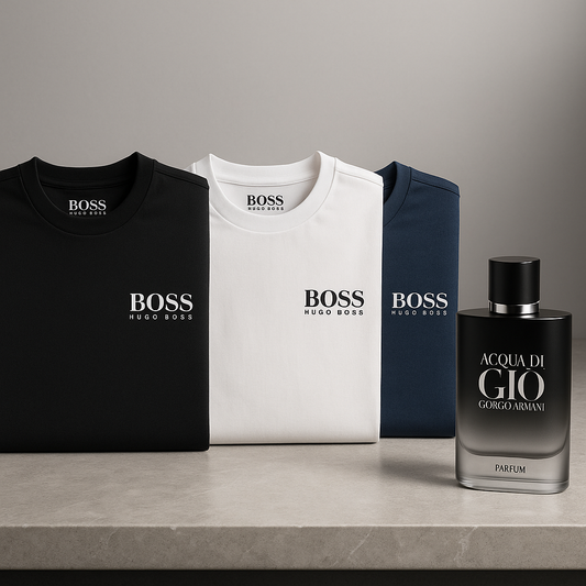 🔥 BOSS PACK: Estilo y fragancia que imponen presencia (3 camisetas Hugo Boss + 1 loción Acqua di Giò)
