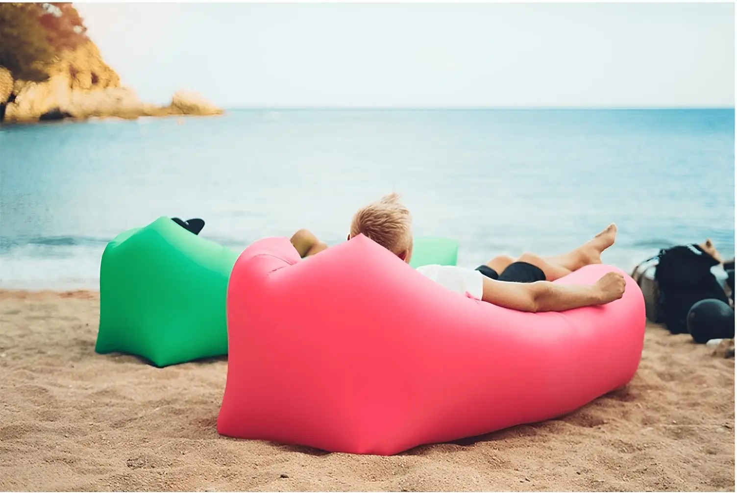 Un práctico sofá inflable tipo puff que no necesita bomba: solo lo llenas de aire con unos movimientos y queda listo para usarse. Compacto, resistente y muy cómodo, ideal para cualquier plan al aire libre o incluso dentro de casa.